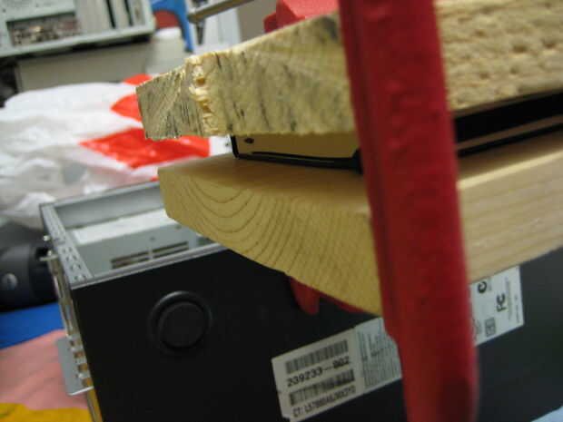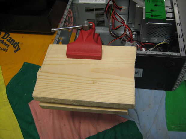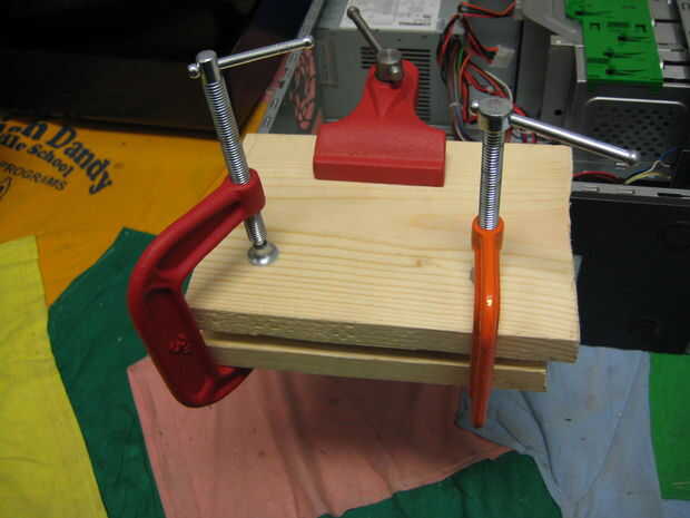 Pinza portátil intercalado con su tornillo de mesa. También Coloque una abrazadera en C o dos a que ofrecen una presión uniforme sobre la superficie de la madera.