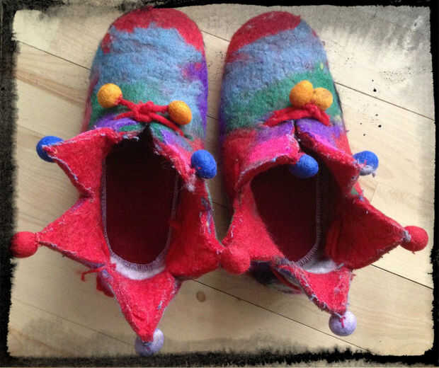 Este proyecto de Reanimación de zapatillas de fieltro fue el resultado de un acuerdo de intercambio/trueque que hice para adquirir un antiguo lavadero (para ser utilizado para otro proyecto de batanado). Las técnicas que utilizo en esta reparación, puede aplicarse a muchos otros proyectos de reparación de batanado.