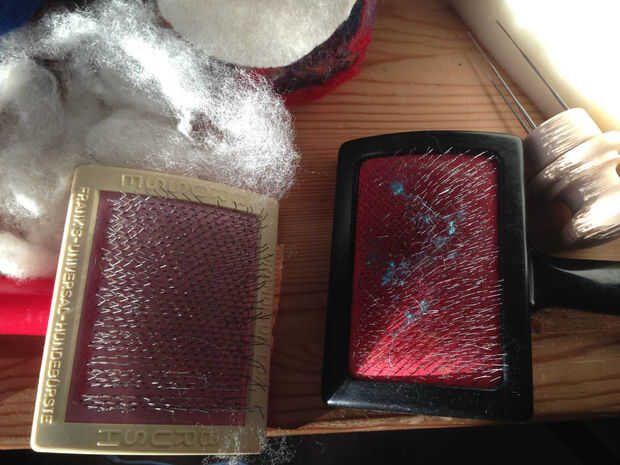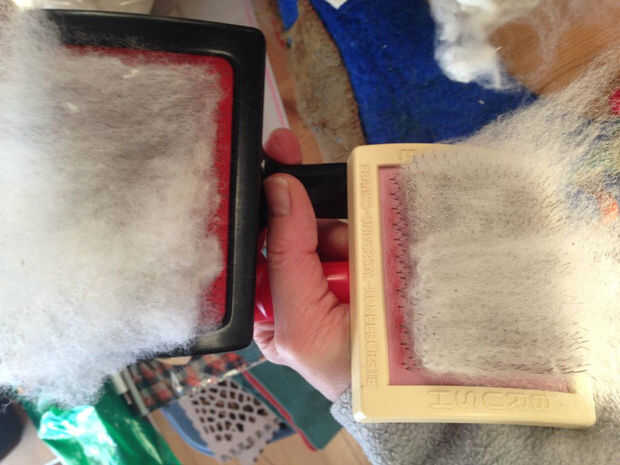 Tarjeta de la vagueación. Ponga un puñado de itinerante en un cepillo y luego con el otro cepillo para tirar en la dirección opuesta. Esto le ayudará a limpiar y alinear las fibras.