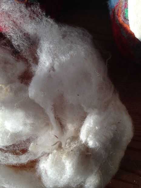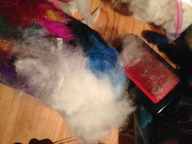 Tirar pequeñas cantidades de mecha cardada fuera el cepillo y los ponen lado a lado en una dirección a través del agujero para crear una capa ligera de la vagueación. Añadir otra capa delgada de la vagueación perpendicular a la primera capa y luego una tercera capa en la primera dirección. Acodar la lana le ayuda a crear un vínculo más fuerte, más incluso y sólido al fieltro.