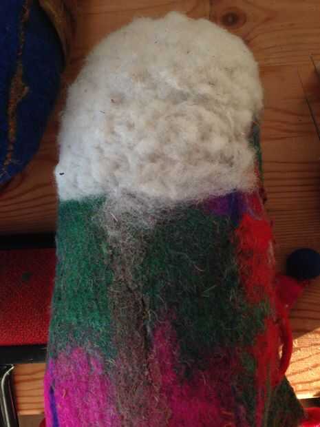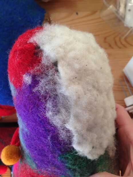 Tomar la aguja de fieltrar (o agujas) firmemente en la mano y empuje a través de la mecha en la espuma para activar y conectar las fibras de lana juntos. Repita este movimiento cientos de veces, asegurándose de trabajar las fibras en los bordes de la reparación. Mantener el movimiento de la aguja hacia arriba y abajo (no palanca al lado) para minimizar la rotura...