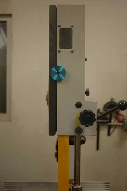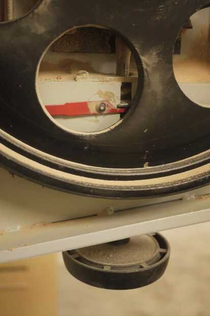 Usted quiere asegurarse de que la cuchilla está centrada cuando girando sobre las poleas, no agitar hacia adelante y hacia atrás. Abrir la parte superior de la sierra y girar la rueda a mano, manteniendo un ojo en la hoja. Debe permanecer centrado en la pisada de la rueda. Ahora encienda la sierra y ver la hoja - debe ir hacia abajo a través de la garganta de la sierra con ninguna vacilación visible.