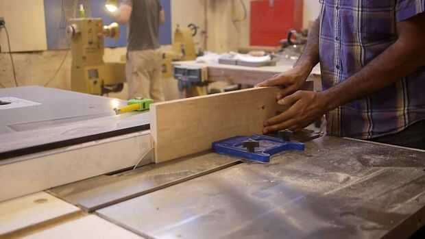 - Para cortar piezas muy delgadas (menos de 1/4") es una buena idea para cortar en el lado exterior de la"basura"de la sierra, lejos de la valla, usando la tabla de canto biselado para medir el corte. Esto es porque puede ser peligroso pellizcar pedazos muy finos entre la hoja y el tope-guía.