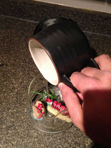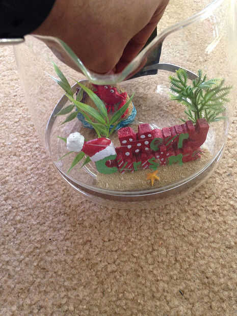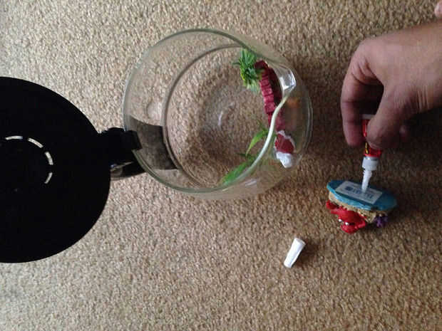 Usando pegamento Fije el ornamento de acuario a la base de la jarra