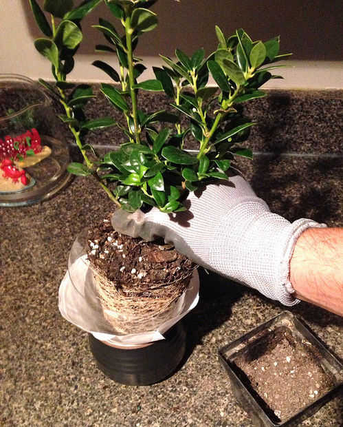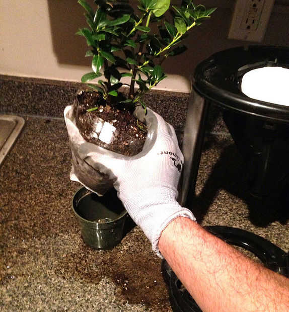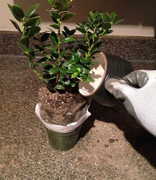La planta de agua hasta que el suelo está húmedo y algo de él cae en el vaso.