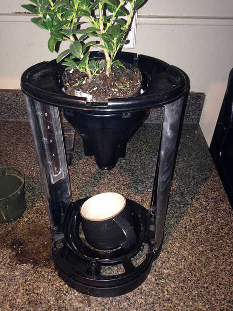 Una vez que haya verificado que la parte superior de la botella se ajusta cómodamente en el soporte de café, coloque el filtro de café y botella en un vaso y agregar algunas macetas.