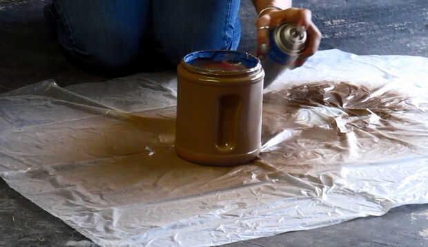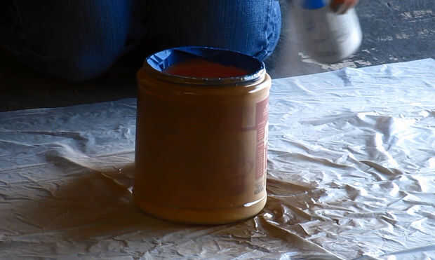 Utilizando la pintura en aerosol para plástico le di el contenedor una capa ligera y uniforme, dar la vuelta a pintar todas las superficies. Si su envase tiene un agarre de mano Asegúrese de rociar en las zonas empotradas para cubrir uniformemente. Me deja que se sequen durante aproximadamente 1 hora y luego lo dio la segunda capa. Mientras que la pintura se está secando, me fui dentro a trabajar en las tapas.