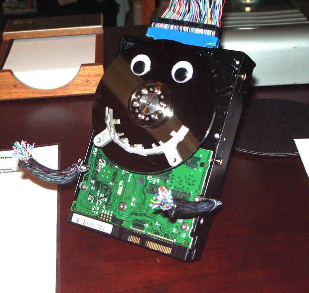 Me llevó el coche aparte, expulsó el rodamiento que tiene el plato en y vuelto a montar el plato en el lado opuesto para dar el "virus" de cierta profundidad. Añadir ojos saltones y utiliza una porción del anillo que sujeta el ventilador del procesador en su lugar para la boca. El cable original se convirtió en el pelo y los brazos.
