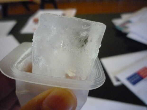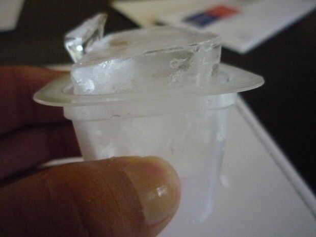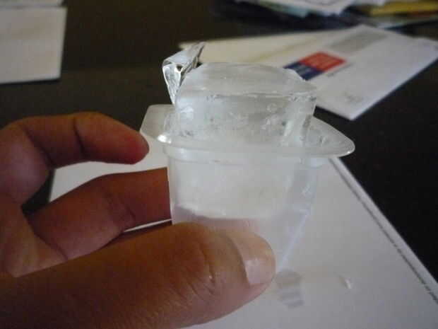 En primer lugar, apriete la parte inferior del cubo de hielo con el índice y dedo medio. ** ADVERTENCIA ** Podría volar fuera del contenedor y en algún lugar de la tierra, así que ten cuidado. Pellizca hasta que hacia fuera.