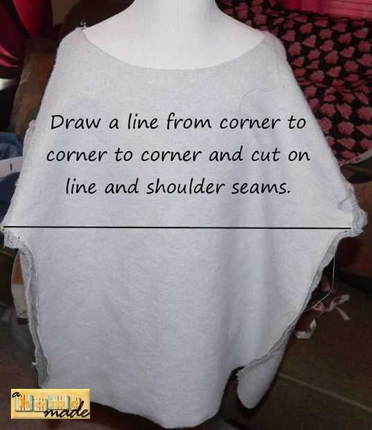Luego lo mira y piensa a sí mismo. "Hmmmm. Esto no se supone que para ser un cuadro!" Dibujar una línea en la parte delantera y trasera de la camisa de la costura del hombro a la costura del hombro como en la foto y cortar en la línea y las costuras de los hombros. Deseche la parte superior de la camisa (con cuello). Ahora voltee todo el asunto. La parte inferior de la camiseta es ahora el escote y la parte superior de antes ahora es el fondo! ooooooooh, cosas de lujo! ;)