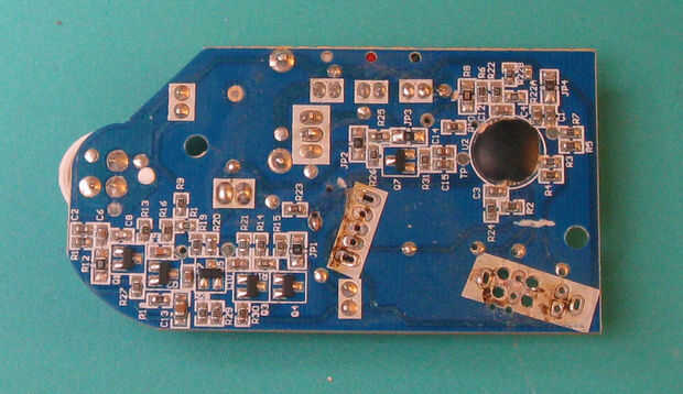 En la siguiente imagen que puedes ver que todos los agujeros son perforados y el rastro se hicieron recortes. Si nos fijamos en las almohadillas del interruptor quitado puedes ver que 6 han sido seleccionados y los 4 exteriores de los seis agrandado. Esto es porque el espacio de almohadilla para los interruptores no es lo mismo que el conector. Usé un taladro #50 para agrandar los orificios y se puede ver que destruí las almohadillas. Debo haber usado un taladro más pequeño. Si puede retener una parte de las pastillas, el trabajo de soldadura es mucho más fácil.