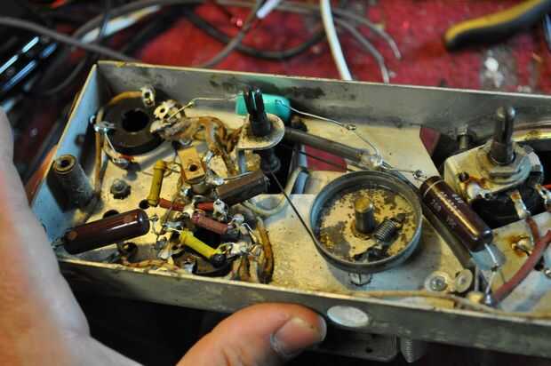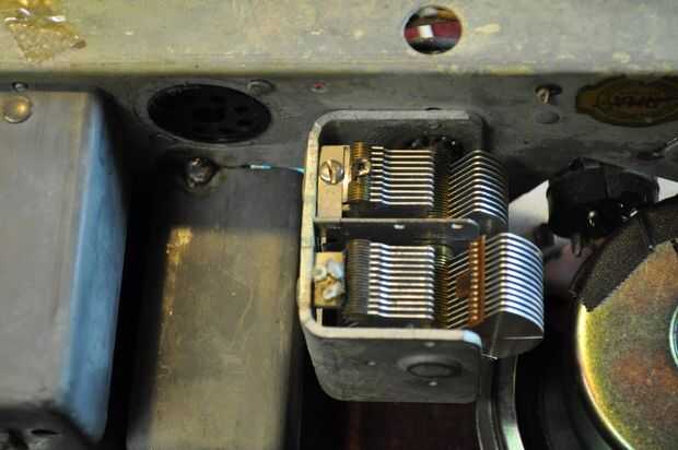 mientras que el epoxi secado, quité el eje que sobresale del orificio marcado puntero del chasis. en este caso, el eje era parte del condensador de sintonía, por lo que tuvo que ser quitado.