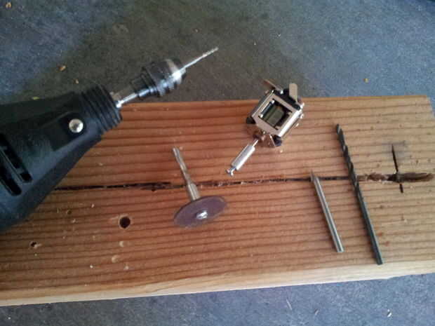 a. usé la herramienta Dremel con un metal regular corte hoja de sierra para cortar el mandril en la intersección del cuerpo que lleva el tornillo y el eje con un diámetro más pequeño (charla sobre el uso de una espina para sacar una espina).