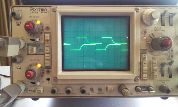 b. a continuación, mientras que el escáner era funcional, leer las formas de onda de las entradas de modulación de ancho de pulso (PWM) para el motor paso a paso con un osciloscopio antiguo. Y se ve como se ve en la imagen siguiente. Esto es para el 1 º dos armaduras con un desplazamiento de fase de 90 grados. Los restantes terminales o las armaduras reciben una forma de onda exactamente invertida de (180 grados de fase cambiada de puesto). El voltaje es de 12V.