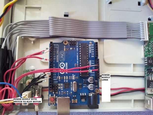 Tenga en cuenta los números de las líneas rojas que indican la numeración de los hilos. I1-I5 indican los cables de entrada, y O1-O4 indican la salida de los cables que van al motor paso a paso. Voy a utilizar la misma numeración para marcar las conexiones a la placa Arduino.