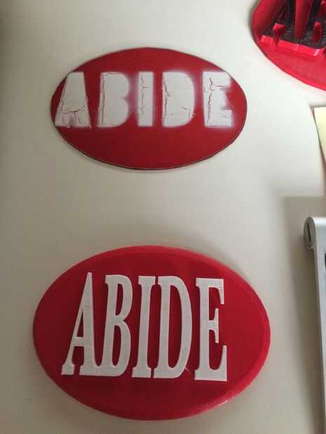 Usted notará que son impresas en dos colores, rojos y blancos. Imprimí estos fuera una Makerbot Replicator 5ta generación, que no es una máquina extrusora doble (no una máquina de dos colores). Para conseguir un color dos impresión debe ver la impresión hasta llegar al punto donde comienza la impresión de las letras. Una vez allí, se corta el filamento y dejar hasta que se detenga la máquina, creyendo que es de filamento. Añadir a su nuevo filamento y reanudar la impresión.