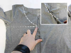 Para hacer tu camiseta listo para eso, vamos a tener que soltar el escote. Dibujar una línea invisible de las axilas de su camisa al centro. Esto es hasta qué punto su escote debe ir hacia abajo. Marcar una curva suave hacia arriba para cubrir el escote de hombro y cortar ese exceso, como se muestra.