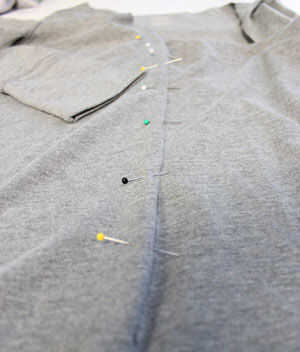 Por un lado de su chaqueta, tome el pedazo más grande de la tela a cortar (el tamaño de 2/3) y el pin en su lugar el borde crudo dejó de cortar por la mitad. Dejo una pieza solapadas por aproximadamente 1/4" pulgadas.