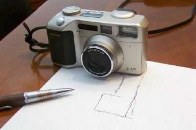 Tomar nota de Dónde está el zócalo para el perno de montaje del trípode en la parte inferior de la cámara. Coloque la cámara en consecuencia en un pedazo de papel blanco. Bosquejo alrededor de la base de la cámara. Esbozo de un reflector y un soporte para el reflector que se conecta el reflector a la porción base.  Ver los cuadros de texto. El accesorio reflector no debe bloquear los sensores que se centran las lentes de la cámara y ajustar la exposición. Esta cámara tiene una ventana ennegrecida entre el visor y el botón del obturador donde se encuentran los sensores.