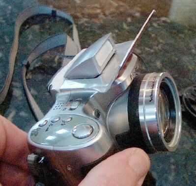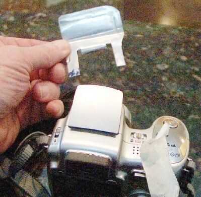 yo prefiero usar mi nueva cámara de Kodak z710 al hacer mi Instructables. Su flash voltea para arriba. Un de puede día hacer un accesorio de flash de rebote que se a la parte inferior de la cámara, pero he estado usando un accesorio de flash de rebote más pequeño, más simple que mantener en su lugar con una tira de cinta adhesiva. No es elegante, pero funciona. La primera foto muestra el accesorio sujeto con cinta adhesiva. La segunda foto muestra otro punto de vista del accesorio de la cámara. Este accesorio de flash de rebote también fue hecho de un pedazo de una vieja placa de licencia.