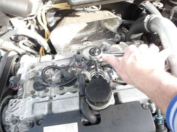 Inserte las nuevas bobinas en los pozos de extrema derecha, asegurándose de alinear el agujero para el tornillo de seguridad. Utilice el cubo de 10mm para fijar el perno de retención de bobina. Conecte los cables de control, asegurándose de que están asegurados con el clip.