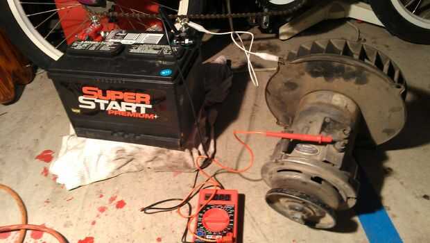 Pongo el alternador a la batería (que tuve el vehículo) (interesante lado tenga en cuenta, alguien me dijo una vez si dejar una batería en el concreto se descarga. Yo no puedo dar fe de la veracidad de esa afirmación, pero luego puse mina en un trapo, sobre unos ladrillos) que había quitado. Yo cocodrilo recorta un cable desde el cuerpo (cubierta cubierta) del alternador a la terminal negativa de la batería porque en el vehículo que sería la tierra. Había recortado el cable negativo de mi voltimetro a la negativa de la batería y el positivo al B + terminal del alternador. Puse mi voltímetro a la lectura en milivoltios DC y hacer girar el ventilador tan rápido como pude con la mano. Registrado en el medidor. Suficiente para mí. (Cuando me enganchado a mi contador para el B + del alternador muerto en el coche, demostró 0. Más tarde cuando hice el examen a mano, fue -0.3 entonces.2 entonces 0 y -5... no estoy seguro lo subió con ella, pero obviamente no estaba funcionando)