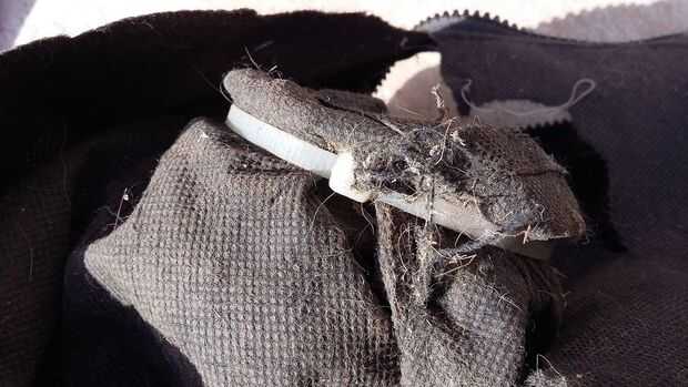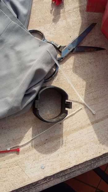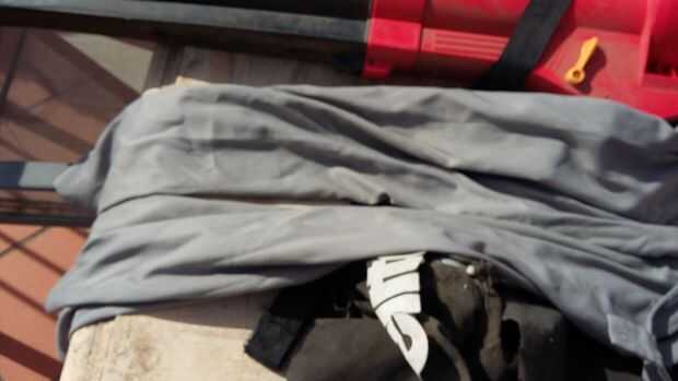 Miré a mi alrededor en mi materia disponible y un viejo par de pantalones saltó a la mano. La bolsa vieja fue celebrada con una atadura - tengo un montón de esos - no bastante tiempo suficiente pero uniendo dos estará bien. Un cordón de zapato viejo hubiera sido bien así pero no tenía los zapatos viejos.