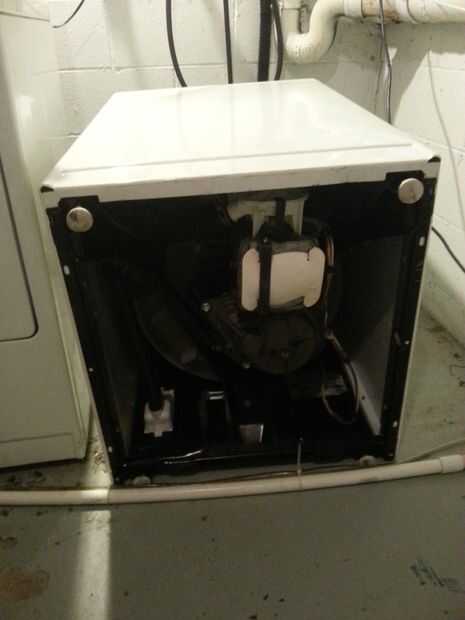 Bastante simple paso, mueva la unidad de la pared hasta que se puede girar para poner en su panel posterior. Desde allí podrá ver la transmisión, motor y bomba de agua. Asegúrese de que usted tiene un montón de espacio para poner la máquina hacia abajo y también ten en cuenta que la máquina puede derramar agua cuando se vuelque la máquina. También ten cuidado con, los bordes de la ca del metal de hoja muy afilada. He recibido cerca de dos docenas de pequeños cortes de este proyecto sin realmente darse cuenta hasta después.