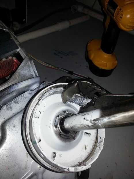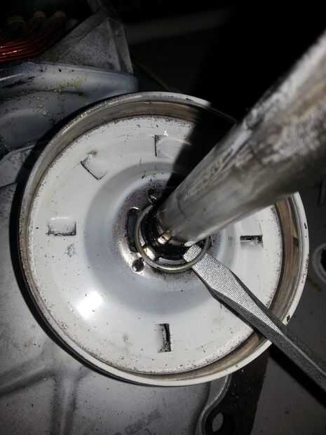 Usted notará un pequeño anillo en el eje. Retirarlo y enviarlo a un lado. Ahora te usará canales seguros para comprimir el resorte en el embrague. Una vez que está completamente comprimido, debe ser capaz de trabajar en la banda de la brida. Usted necesitará volver a utilizar el destornillador para soltar el anillo de retención cerca del centro de la brida. Después de retirarlo, podrá quitar la brida del viejo.