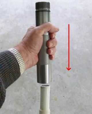 El tubo de acero color beige en la foto es de un viejo paraguas de patio. Hace un buen conductor para empujar al conjunto del interruptor Sub sale del extremo de la bombilla de la linterna. Con fuerza pinchó la linterna hacia abajo en la dirección de la flecha roja hasta que había conducido al Sub ensamble del interruptor del cañón de la linterna. El proceso fue mucho como establecer una valla de acero. En el proceso de piezas rotas del interruptor viejo salieron con él. En este momento mis planes eran muy indefinidos y no sé si el Sub ensamble del interruptor trabajaría para mí, ni que sabía si quería volver a usar. Pero, el conjunto de Sub interruptor indemne, que no sean el interruptor. Después, he reinstalado el anillo de retención. En este momento mi plan fue tomando forma y me di cuenta de que necesitaría el anillo de retención para mantener al Sub ensamble del interruptor en su lugar.
