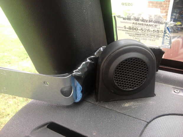 Antes de ir más lejos, 'dry fit' la sección de esponja entre el pilar de la ventana y el altavoz.  Doble las correas a la forma que se desea finalmente, prestando más atención a la parte detrás del altavoz.  Debe ajustarse a la cordillera que se ve en la foto si es posible, mantener las correas de la mudanza en el viento.