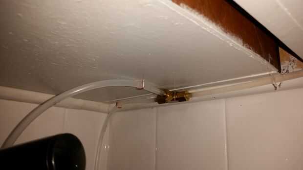 En mi caso, esto significaba hacer un agujero en la encimera. Corrí tanto del tubo como pude debajo del mostrador y detrás el labio bajo mis armarios. Tubo de plástico como este no debe estar expuesto a demasiada luz UV, así que intenté mantener un camino sombreado. Finalmente puedo intentar cubrirlo con algún tipo de sheething.