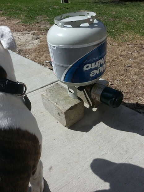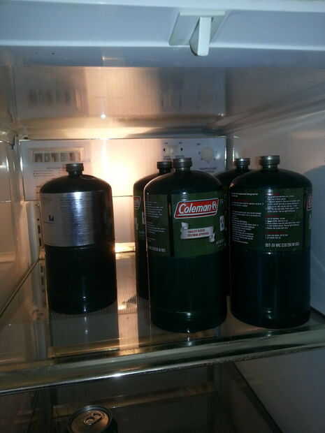 Volver a llenar los tanques de propano de 1 libra es bastante recta hacia adelante. Primero de seguridad es lo más importante. Asegúrese de que al rellenar te estén fuera y que no llamas al hacerlo. La mejor manera de rellenarlas es poner los tanques de 1 lb en la nevera para conseguir frío. Esto ayudará el llenado de propano mejor. Atornille el adaptador al tanque de 20 lb. El roscado para tesis están frente a la normal. Yo utiliza bloques de cemento para apuntalar el tanque para que pueda llegar a bajo y activar los tanques de 20 lb. Tornillo en el tanque de 1 lb en el tanque de 20 libras en la position.then derecha arriba Voltee los tanques conectados sobre las losas de concreto. Ahora todo lo que necesitas hacer es encender el tanque de 20 libras todo el camino y deje que el tanque de 1 lb a llenar. Escuchará el llenado del tanque. Espere hasta que no escuche el relleno apagar la tapa de tanque de 20 libras al lado derecho y desatornille el tanque de 1 lb.