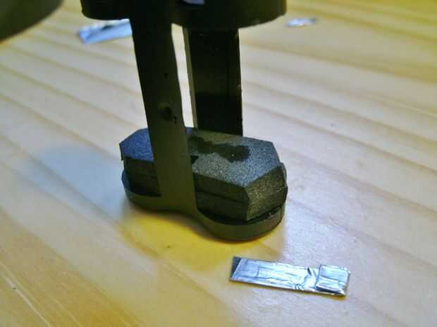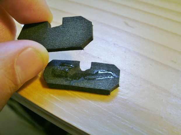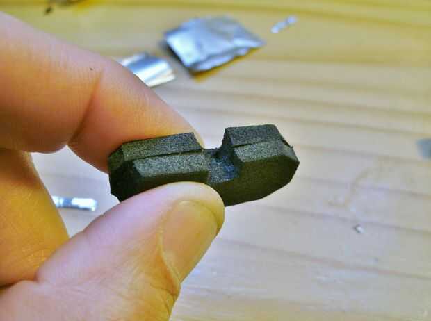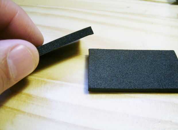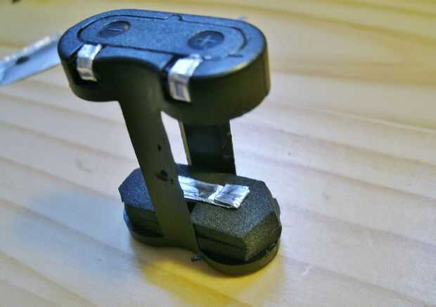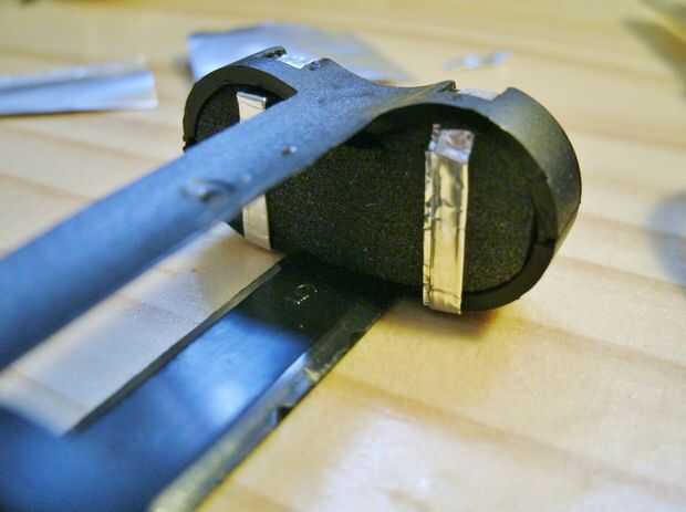 3. corte y coloque espaciadores de espuma para la parte inferior de la estructura de la batería al igual que con la parte superior. Puesto que las baterías CR2 son más cortas, necesitaba 2 espesores de alfombrilla de ratón para que encajen perfectamente.