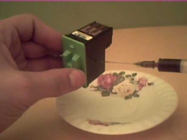 Lo único que tienes que hacer es conseguir la cantidad de tinta que desea rellenar en la jeringa, y entonces usted necesita tomar un encendedor o una llama abierta y calentar la aguja hasta que la tapa se convierte rojo caliente, después ser realmente rápido para meter el cartucho en el centro o donde crees que es mejor y empezar a llenar hasta que la tinta gotea hacia fuera de alrededor del orificio
