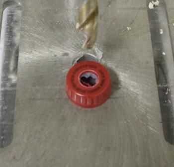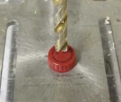 Empezar por taladrar un agujero de 1/2" en el centro de la tapa. Usé un taladro pero si no tienes uno, voltee la tapa y taladre el agujero de la parte inferior, a través de la tapa y en un pedazo de madera de desecho.