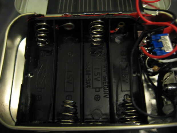 Usa la pistola de pegamento caliente para fijar la célula solar en la tapa. Antes de ponerlo en, cubrí todos los contactos en la parte inferior con cinta aislante. A continuación, pongo el portapilas en la lata. También cubrí los contactos expuestos sobre el soporte con cinta aislante de primera. Con todo, es un ajuste muy apretado, pero una vez debajo del borde del cuerpo principal de la lata, es agradable y cómodo! El interruptor, LED/soporte y cable de alimentación deben montarse en su lugar después de que todo está conectado juntos.
