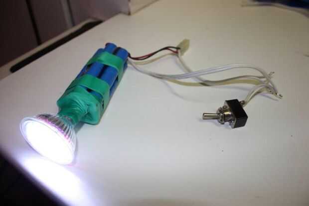 tuve para que mi batería se ajuste y para ello tuve que rodar para arriba. La pila es de 1.2V básicamente 10 pilas en serie. Tuve que cortar el envoltorio de plástico y cinta juntos. Un paso que hice hace unos meses fue a insertar dos cables que viene de la batería. Sólo los soldados a los pines en el conector. También decidí soldar soldadura un cable a la bombilla en lugar de un conector de ver que hay menos equivocarse. La polaridad no importa desde downlights generalmente alimentado por corriente alterna. Entonces tuve que hacer es todo hasta un interruptor de alambre.