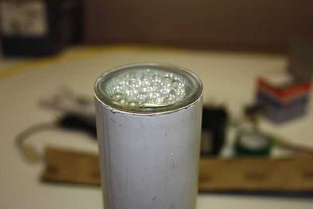 Para evitar el temblor de la batería y dañar del foco de la agitación batería, he insertado un trozo de espuma aislante de la tubería alrededor de la batería hasta el bulbo. Para asegurarse de que no hay agua no conseguir en agregó un poco cemento PVC extra alrededor del borde de la lámpara justo antes de que presiona en su posición.