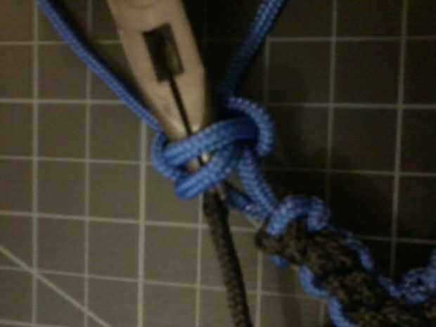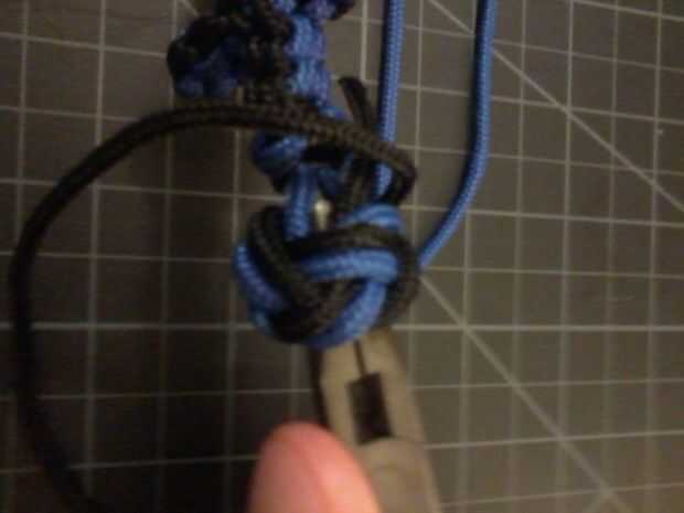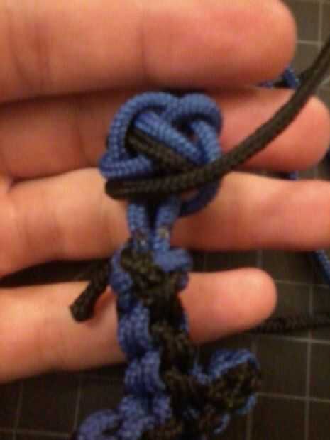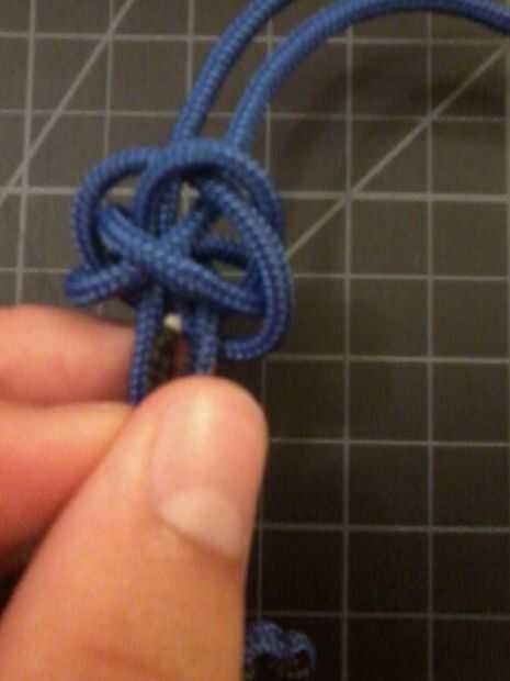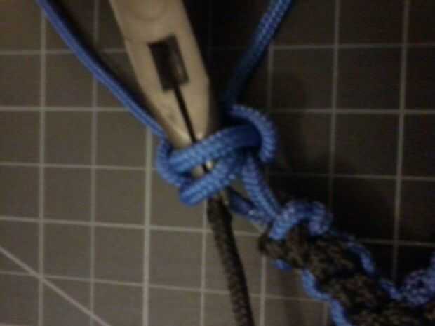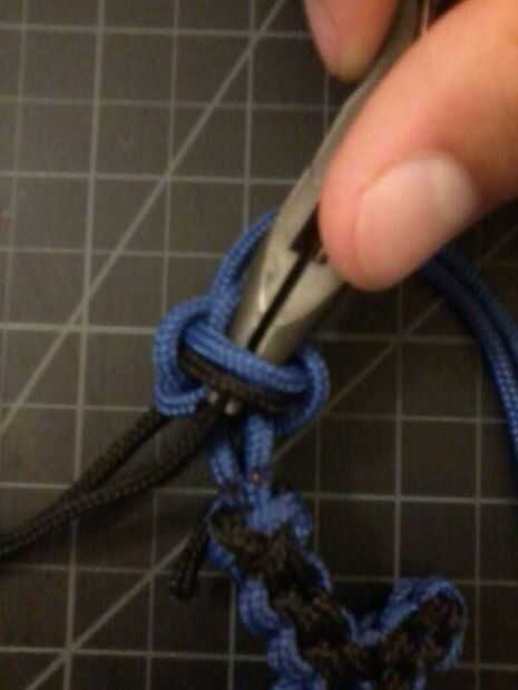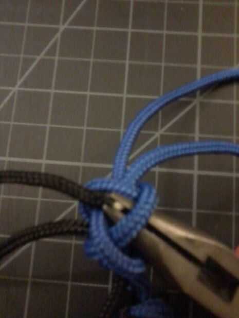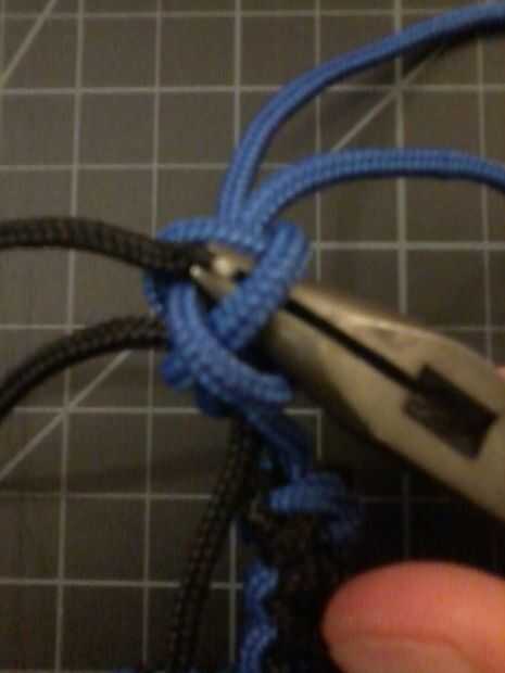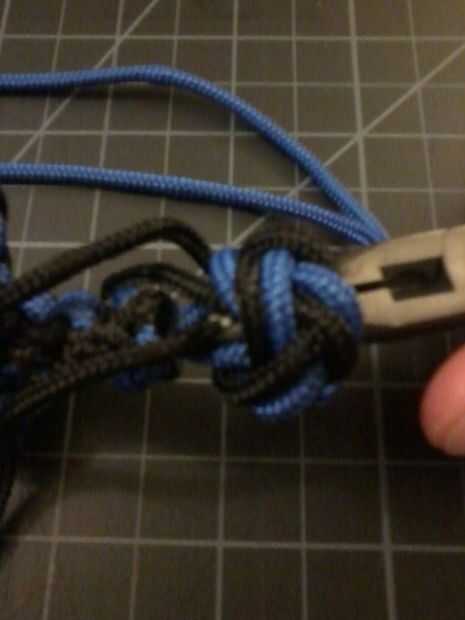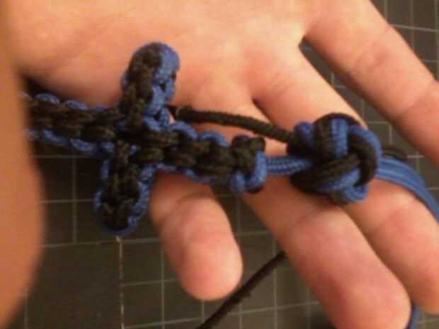 FIDS ayudaría en esta parte. Esto es terminando el nudo del Padre nuestro, poniendo el acento de color a lo largo de lado el color principal. Calcular la holgura, apretar, cortar y fundir.