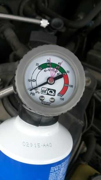 Ajustar el manómetro a la gama de la temperatura ambiente exterior. La V de color rojo formado por las flechas indica esta gama. Dependiendo de la temperatura, la presión necesaria para llenar el aire/acondicionado con el refrigerante va a cambiar. Se refieren a la parte posterior de la lata para encontrar la presión adecuada para rellenar a basado en la temperatura ambiente. Dependiendo del clima, puede ser necesario usar guantes. La can obtiene bastante fría como se libera el refrigerante.