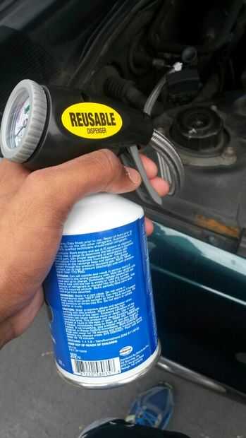 Apriete el gatillo agitando lentamente la lata izquierda y derecha de 3 a 4 segundos a la vez. Una vez liberado, controlar la presión. Hacer esto hasta que se alcance la presión deseada. Una vez rellenado, levante el anillo de fondo en el conector y el ascensor para tomar la manguera en el puerto de presión del lado de baja. Después de unos minutos, el aire acondicionado debe soplando aire frío. Si no es así, puede haber fugas en los tubos de aire acondicionado, en que caso un kit de tinte UV es necesaria para encontrar la fuga.