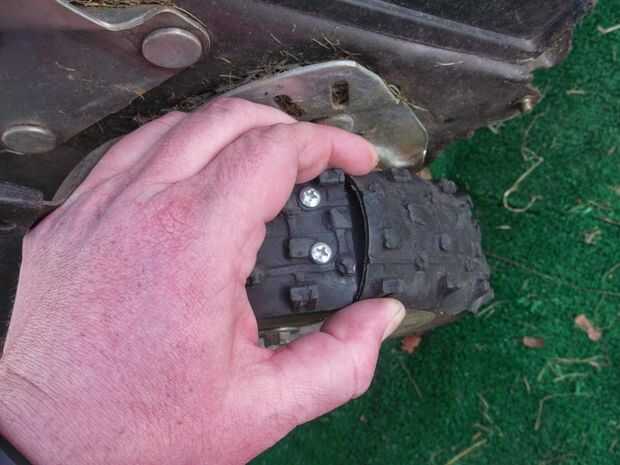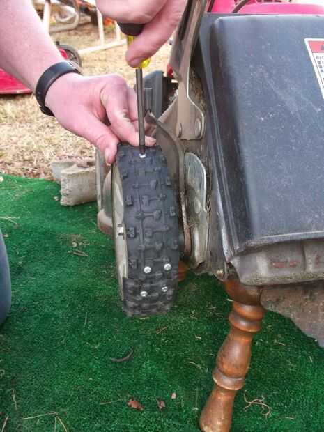 Coloque dos tornillos en el extremo de la banda de rodadura para empezar. Luego Envuelva la banda de rodadura en el neumático, poner en unos tornillos como vas a mantener apretado. Una vez en el otro extremo, cualquier ajuste adicional y añadir dos tornillos más. Terminó con total de siete tornillos: dos en cada extremo y tres espacian alrededor de la llanta.