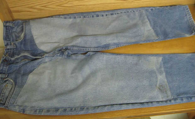 El secreto de recauchutado es utilizar la tela todavía bien en el último par de pantalones vaqueros recauchutados como el doubler (y triplicador) para los neumaticos nuevos. Mis neumaticos se desgastan generalmente cuando aparecen agujeros en el doubler en las rodillas o bolsillos. A veces, los primeros agujeros aparecen justo debajo de los bolsillos traseros. Pero, en este punto, todavía hay un montón de vida izquierda en la parte posterior de cada pierna del pantalón y en el frente de la pierna del pantalón por debajo de la rodilla. Este tejido normalmente desechado es el secreto de recauchutado. Aquí está cómo hacerlo: