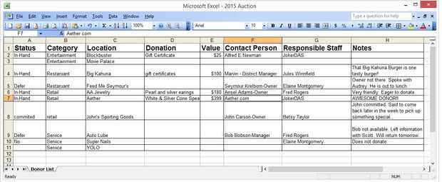 - Estado -esto es un artículo rápido que indica el estado de la donación de la empresa. Un simple "sí/no" no es suficiente en la mayoría de los casos. Cuando empezamos golpeando al pavimento, algunos confiaría y me pidieron que regrese en una fecha posterior para recogerlo, otros me entregaron la donación en el lugar. Algunos tuvieron que diferir a una autoridad superior. Sea cual sea la razón, nos pareció mejor indicar en mi formulario. Utilizamos los Estados de "No" si ellos escogieron no donar, "Mano" si caminamos lejos con un artículo, «comprometido» si dicen que donarán, pero no sabía exactamente lo que en el tiempo y significado "diferido", el contacto fue hecho, pero tenemos que volver a reunirse con el dueño o el gerente.