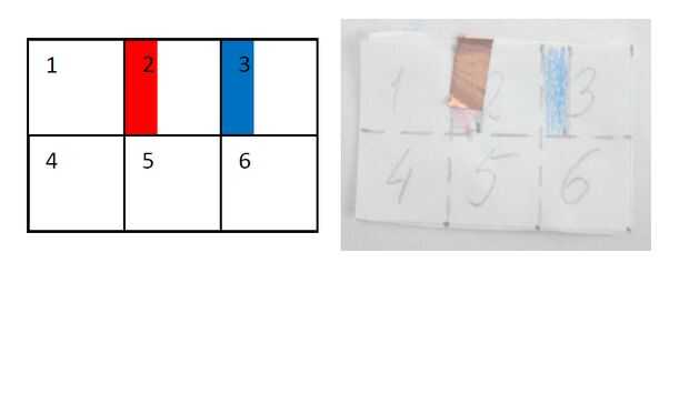 Preparar dos tiras de cinta de cobre - tira "rojo" con longitud de 4,5 cm y tira "azul" con longitud de 2 cm.