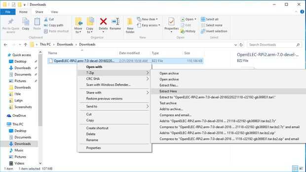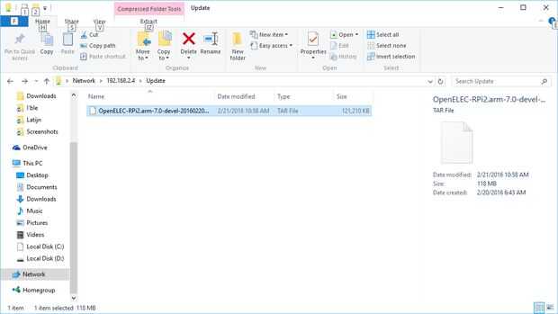 Ahora abre tu Administrador de archivos (Nautilus) e ir a tu carpeta de descargas. Ahora debe haber un archivo OpenELEC-RPi2.arm-7.0-devel-20160220221118-r22192-gb369831.tar. Copiarlo (CTRL + C)