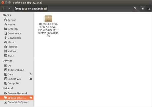Así que haga doble clic en el servidor en mayúsculas (AIRPLAY) y vaya a la carpeta de 'Actualización'. Pegar el archivo .tar de construir todas las noches allí.