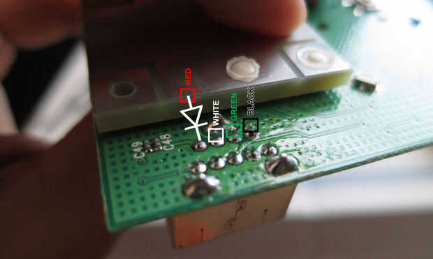 - La soldadura en el cable blanco en el punto de soldadura en la Junta. El punto de soldadura que se debe soldar a es el lado donde se suelda el diodo en el 2 º uno.