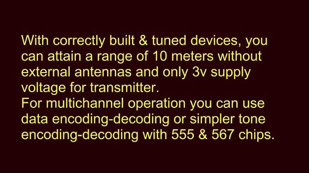 modulación del transmisor es OOK(encendido apagado clave). Para aplicaciones simples de ON-OFF lazo entrada de modulación del transmisor + 3v y energía a través de un interruptor. Para la operación multicanal, utilice datos tono más simple de codificación-decodificación o codificación-descodificación con 555 y 567 fichas. Reducir el valor de R7 a 10k de la tarifa de datos hasta 1000bits/s
